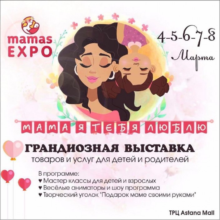 Праздничная выставка в ТРЦ Astana MALL "Мама, я тебя люблю!" организует мастер-классы, где дети смогут сделать подарки мамам и бабушкам своими руками. А женщин ждут интересные семинары по нумерологии, визажу, правильному питанию, стилю и йоге. Лейтмотив выставки - семья, поэтому организаторы Mamas Expo презентуют посетителям магазины игрушек, детской и взрослой одежды, детские сады и развивающие центры, хэндмейд-мастеров, товары для беременных, салоны красоты, а также медицинские и спортивные центры.