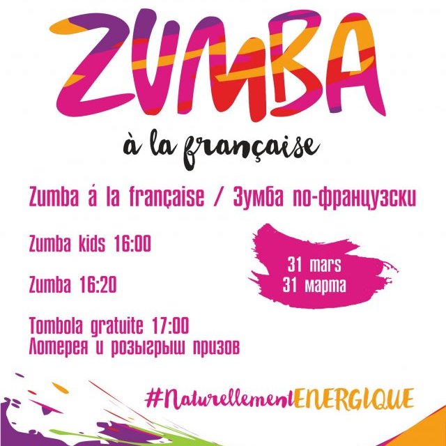 Массовые танцы зумбы по-французски организует Французский альянс Астаны вместе с танцевальными клубами города. Все желающие могут собраться в ТРЦ MEGA Silk Way и научиться основным движениям этого зажигательного танца! После мероприятия состоится лотерея с подарками от организаторов и партнеров.