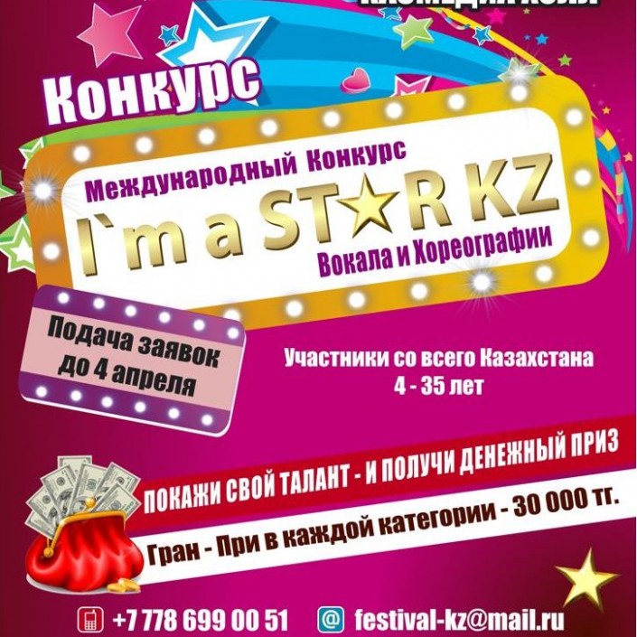 В холле Казмедиацентра пройдет фестиваль-конкурс лучших хореографических и вокальных коллективов Астаны - I’m a STAR KZ. Зрителей ждут яркие номера, красочные выступления в современных и народных стилях, а также модные постановки!