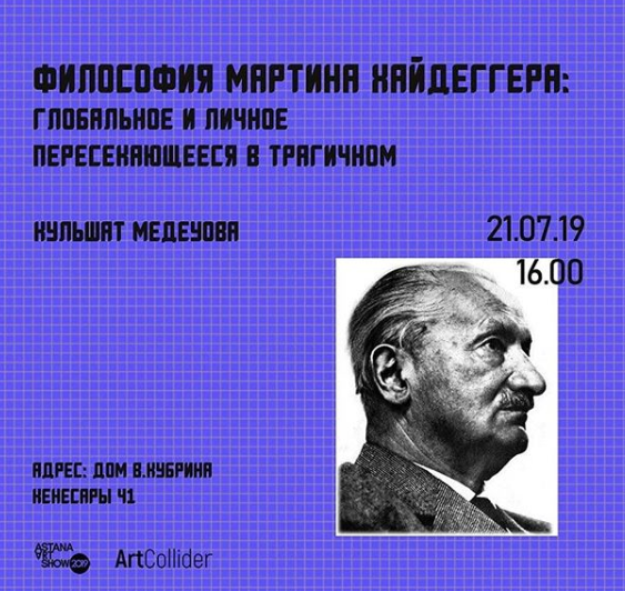 Лекция "Философия Мартина Хайдеггера: глобальное и личное, пересекающееся в трагическом". Лектор - Кульшат Медеуова, доктор философских наук, профессор кафедры философии ЕНУ имени Гумилева. Лекция проходит в рамках выставки "Воспоминания. Диалоги памяти". Место проведения - Дом Василия Кубрина по улице Кенесары, 41.