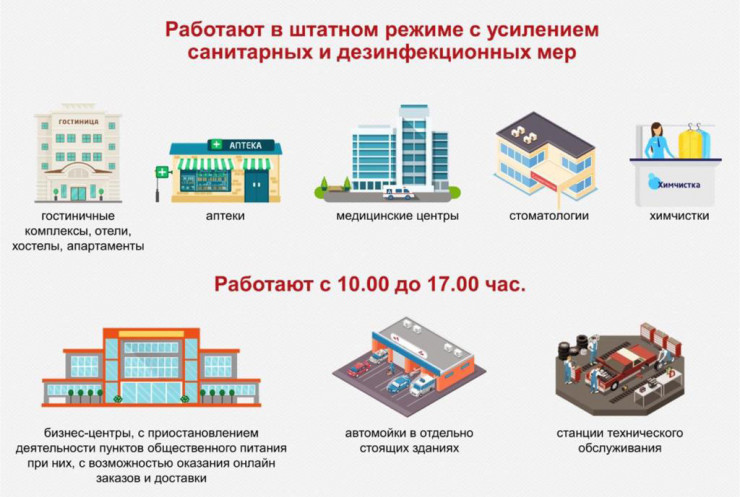 - Усилены санитарные нормы. Дезинфекция проводится во всех соцобъектах, ТРЦ, рынках, подъездах ЖК, гостиницах, а также на остановках, в автобусах и так далее.