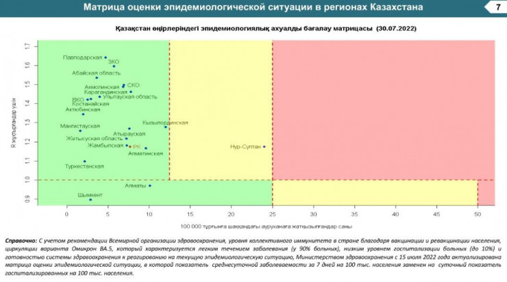 Согласно опубликованной матрице оценки эпидемиологической ситуации в регионах, в "желтой" зоне находится Нур-Султан, однако Кызылординская область приближается к переходу из "зеленой" зоны в "желтую".