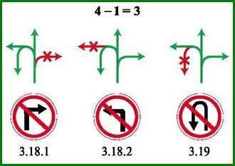 "Небольшой лайфхак, как это легко запомнить и не путаться на будущее: для трех знаков, запрещающих поворот налево, направо и разворот, действует правило "4-1=3": при четырех возможных направлениях (прямо, налево, направо и на разворот) запрещено только одно направление, остальные три - разрешены, посмотрите на картинку № 2, очень наглядно!" - добавила пресс-секретарь КАП МВД.