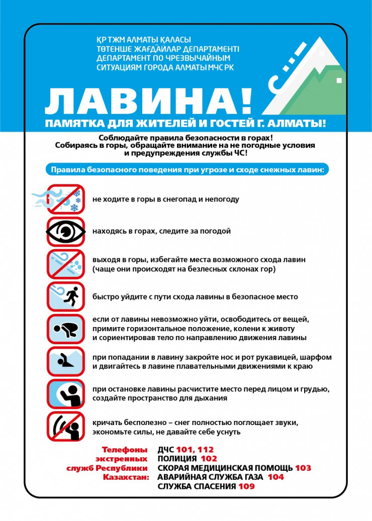 "Департамент по чрезвычайным ситуациям города Алматы и "Казселезащита" рекомендуют в это время не посещать горную местность, остерегаться крутых заснеженных склонов, не выходить за пределы ограждений на горнолыжных курортах", - говорится в сообщении.
