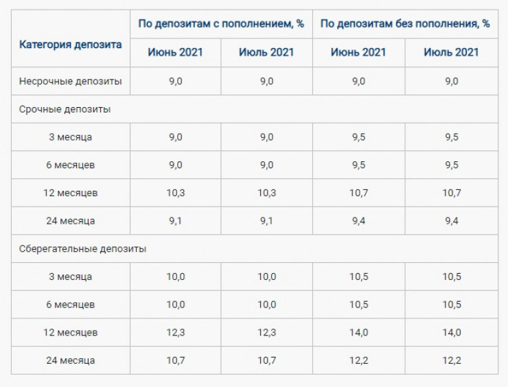 Казахстанский фонд гарантирования депозитов (КФГД) объявил максимальные ставки по депозитам на июль 2021 года, передает Tengrinews.kz со ссылкой на сайт фонда.