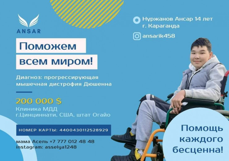 Напомним, подросток из Караганды Ансар Нуржанов заболел мышечной дистрофией Дюшенна в 2016 году. С тех пор он вместе с мамой борется за жизнь. На протяжении нескольких лет он не мог получить от системы здравоохранения Казахстана препарат "Аталурен". От отчаяния мальчик вместе с мамой написал обращение к футболисту Криштиану Роналду.