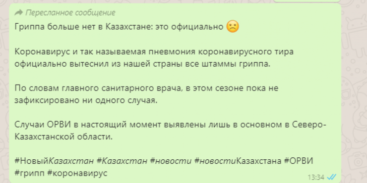 "Қазақстанда енді тұмау болмайды. Бұл ресми. COVID-19 бен коронавирус типтен пневмония тұмаудың барлық штаммын елімізден ресми түрде ығыстырып тастады", - делінген WhatsApp мессенджерінде тараған хабарламада.
