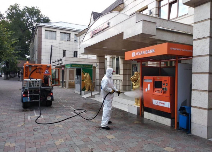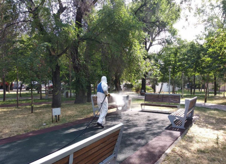 Дезинфекция улиц, парков, скверов тротуаров и сопутствующих объектов (уличных урн, скамеек, остановок, банкоматов, терминалов, подземных и надземных пешеходных переходов) производится силами ГКП "Алматы Тазалык" и подрядными организациями районов. В данной работе задействовано 70 единиц техники и 150 человек. Дезинфекция объектов торговли и сферы услуг проводится их собственниками.