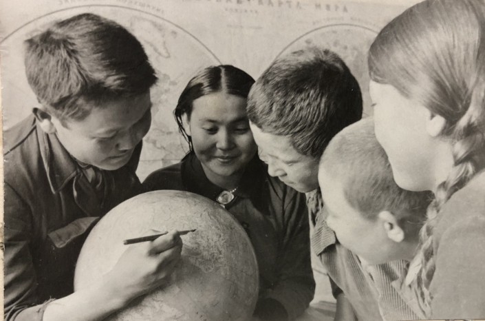 Алма-Ата. 1938 год. Три ученика школы № 12 имени Кирова на перемене. Одна увлечена чтением, две другие заняты изучением глобуса. Школьной формы как таковой нет. Но можно заметить общий стиль в одежде. На девочках однотонные платьица, кофточки на пуговицах, верхняя рубашка.
