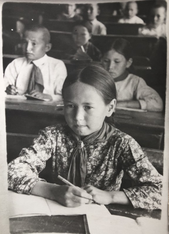 Урок арифметики в меркенской средней школе. На девочке - пионерский галстук и платье с цветочным узором.