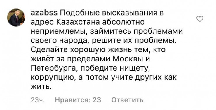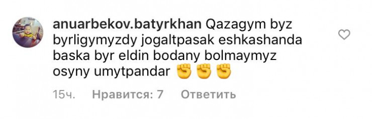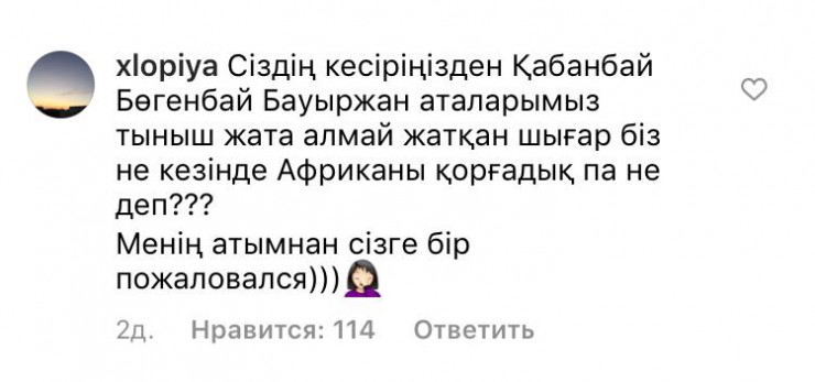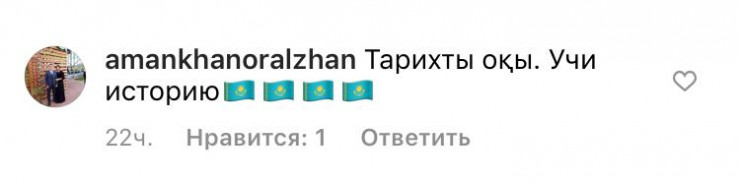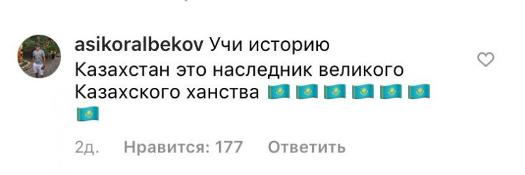 Депутаттың Instagram желісіндегі парақшасындағы соңғы жазбасына 2 мыңнан аса пікір жазылған. Кейбір қазақстандық депутатқа Қазақстан тарихын оқуға кеңес берген.