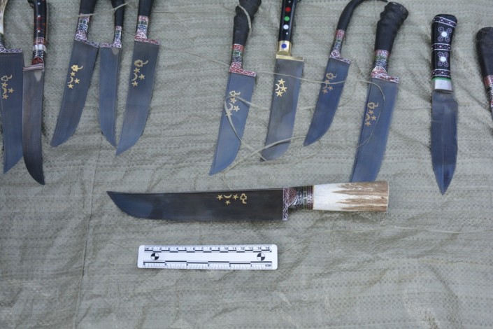 Ножи были в шести мешках, мужчина - гражданин России - перевозил их в автомобиле. Все предметы кустарного производства, с необычными ручками и узорами на лезвиях.