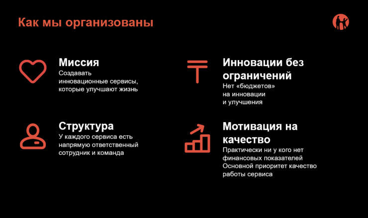 "Клиентоориентированная компания - это когда клиент может в этой компании одному человеку задать любой вопрос про его продукт и получить ответ, - пояснил Михаил. - Когда у тебя 12 миллионов клиентов, ты начинаешь организовывать различные промежуточные каналы - чат или бесплатный кол-центр, чтобы эффективно общаться с клиентами. Но у каждого продукта, сервиса в нашем приложении всегда есть напрямую ответственный человек, напрямую ответственная команда. У каждого бизнеса тоже есть лидер, который занимается развитием и стратегией".