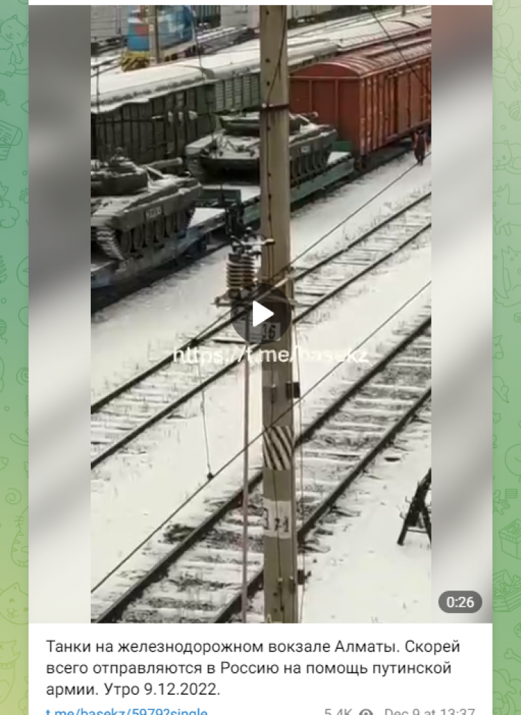 В мессенджерах распространилось видео, снятое на вокзале Алматы. На путях стоят платформы с погруженными танками. В подписи указано, что эту военную технику отправляют в Россию.