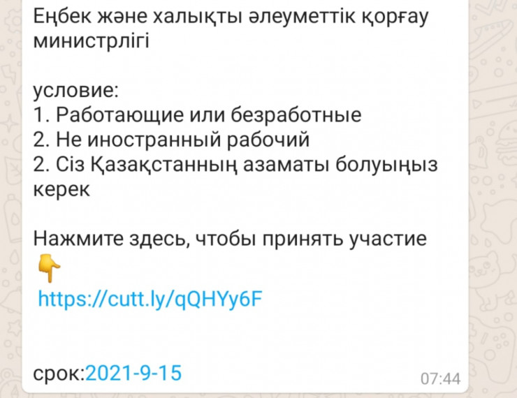 "Информация о том, что Министерство труда и социальной защиты населения РК проводит опрос с последующим вознаграждением в размере 50 тысяч тенге, распространяемая в мессенджерах и социальных сетях, не соответствует действительности. МТСЗН не проводит никаких опросов граждан посредством мессенджеров и социальных сетей", - сообщили в ведомстве.