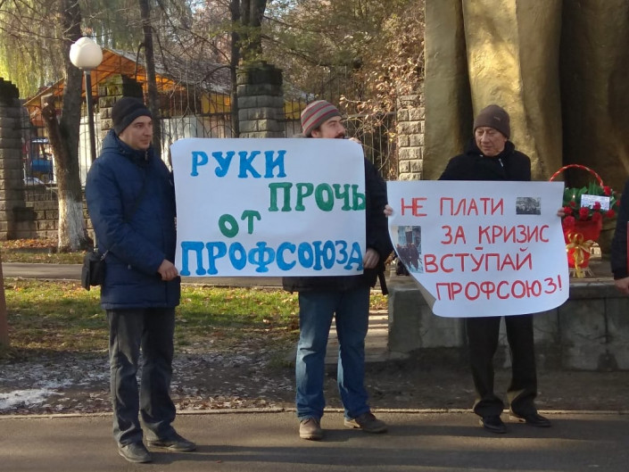 На их транспарантах написаны такие лозунги, как "Руки прочь от профсоюза", "Не плати за кризис, вступай в профсоюз".