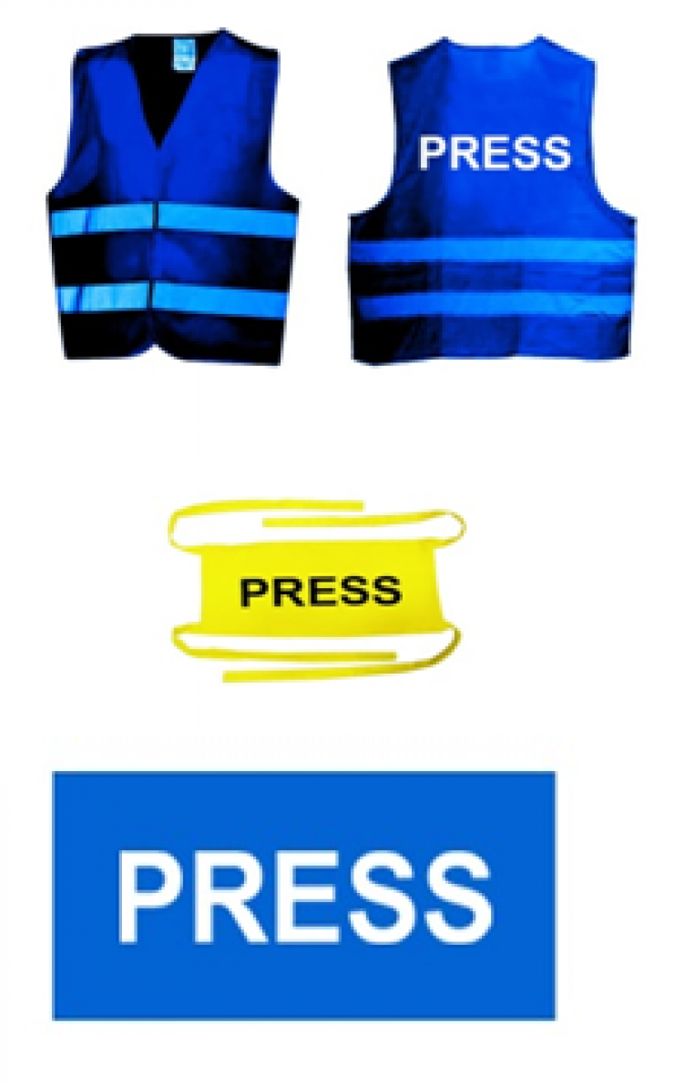 - ярко-синие жилеты со светоотражающей полоской и надписью PRESS на латинице;