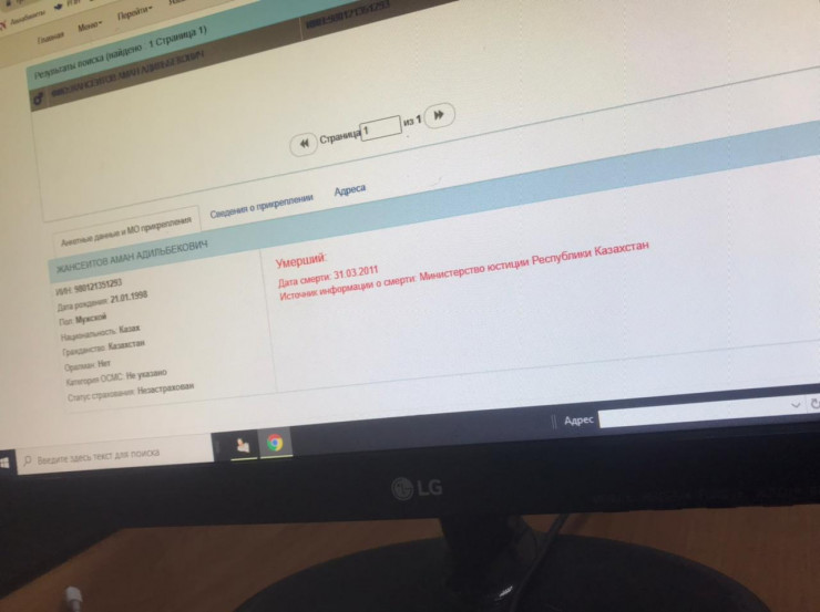 "Мы с братом были погодками, его звали Азан, меня Аман, он умер в 2011 году 31 марта. Дата смерти брата высветилась напротив моего ИИН при проверке статуса в поликлинике. Источником информации о моей смерти указано Министерство юстиции республики. Получается, что в официальной базе данных меня похоронили вместо брата", - говорит Жансеитов.