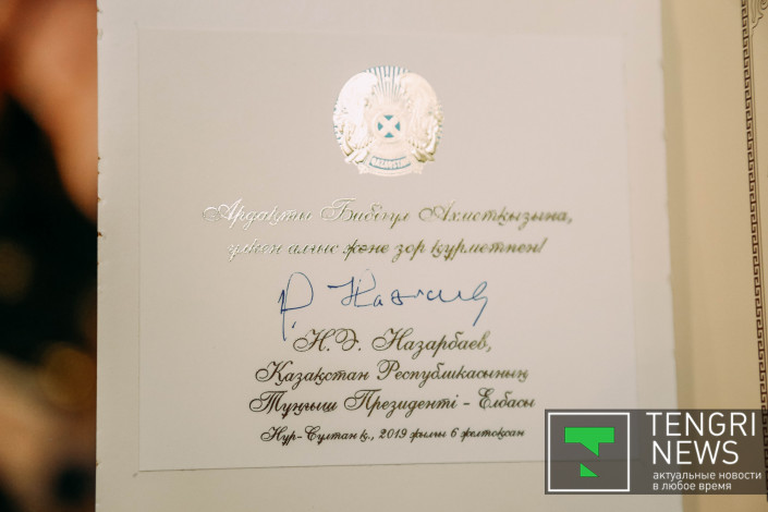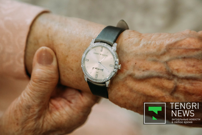 А эти часы мне подарил наш Елбасы Нурсултан Назарбаев, когда я была у него на приеме. Подарок на мое 90-летие. Я ему сказала, что у меня уже есть одни часы. Он ответил, что эти часы "изящнее и больше подойдут мне". Часы с его подписью и высокой швейцарской фирмы.