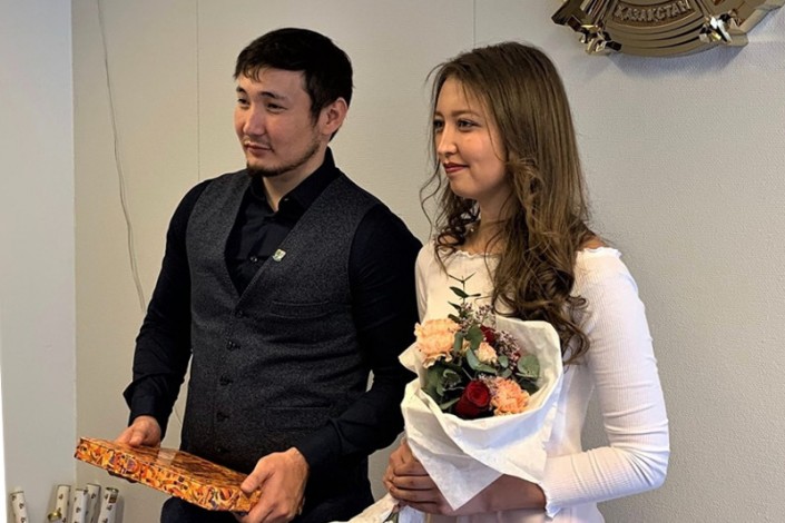 Как сообщается на странице посольства в Facebook, молодоженами являются докторант Юго-восточного университета Норвегии Елжас Жаксылык и магистрант Университета Gijon в Испании Асель Елюбаева. Пара познакомилась в период обучения по программе бакалавриата в КБТУ в Алматы. Чтобы разделить радостное событие, из Казахстана в Осло приехали друзья молодоженов, которые выступили свидетелями государственной регистрации заключения брака.