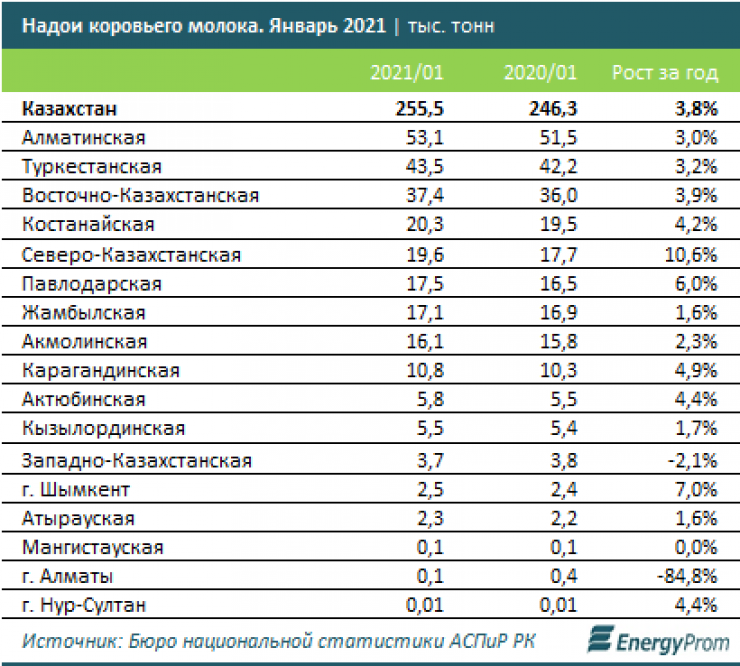 "В региональном разрезе треть всего производства молока приходится на Северо-Казахстанскую область: 16,2 тысячи тонн. Следом идут Алматинская и Акмолинская области", - пишут аналитики.