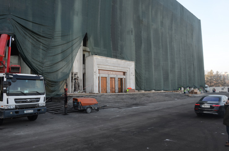 Курирующий работы по реконструкции здания заместитель акима Алматы Мухит Азирбаев отметил, что изначально они хотели максимально сохранить элементы здания и восстановить только серьезно пострадавшие участки. Часть мрамора, покрывающего фасад, пытались отмыть различной химией, и частично это даже удалось, однако предварительные результаты технического аудита показали, что, по-видимому, конструкцию всего фасада придется менять.
