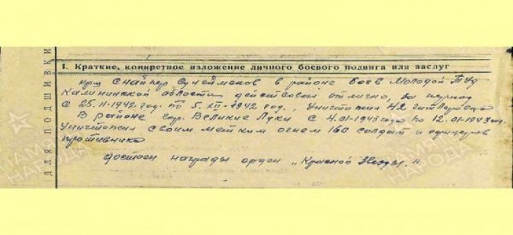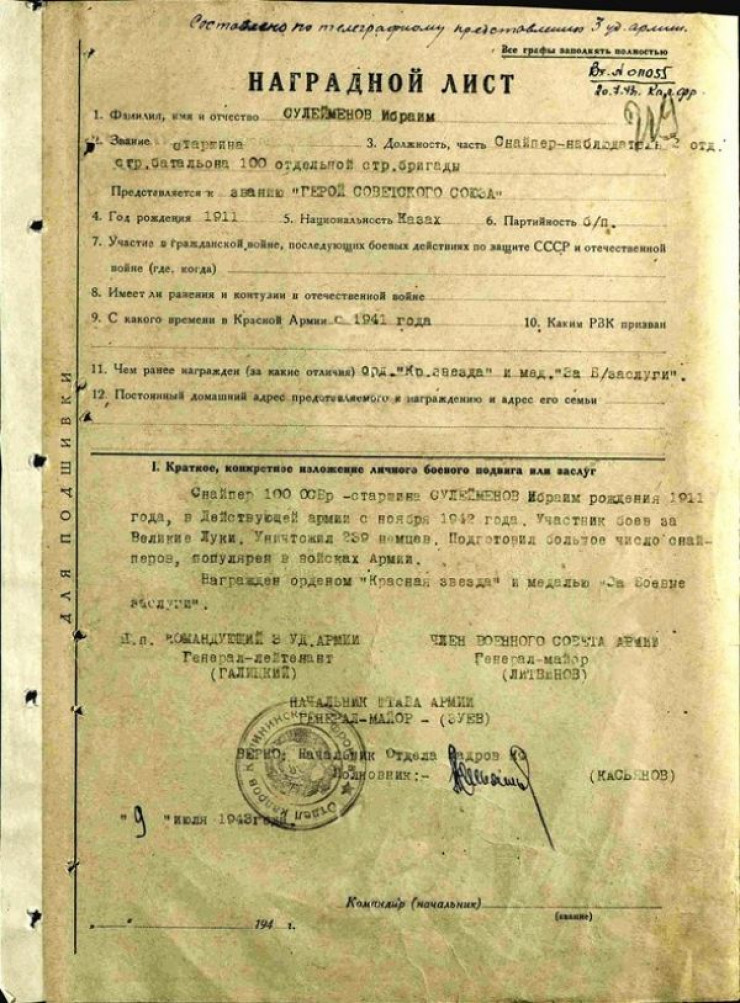 Из наградного листа Ибраима Сулейменова с представлением на орден Красной Звезды следует, что всего за два с половиной месяца пребывания на передовой он успел довести количество лично уничтоженных им врагов до 217. "Такого феноменального снайпера с подобным рекордом результативной стрельбы за короткий срок не знает история Второй мировой войны", - пишет сенатор.