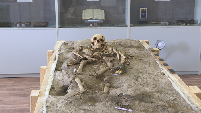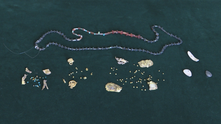 Захоронение молодого человека обнаружено в наземной гробнице. По оценке специалистов, парень умер в возрасте 17-18 лет. Возле места погребения археологи нашли немало золотых украшений. Ученые предполагают, что они были принесены в виде подношения. Но больше всего ученых удивил золотой бисер, которым были расшиты сапоги погребенного.