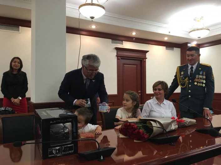 Министр поздравил семью альпиниста, надел на Максута Жумаева казахский чапан, его супруге подарил картину, а детям - игрушки и наручные часы, отметив, что младший сын Максута завтра отпразднует день рождения.