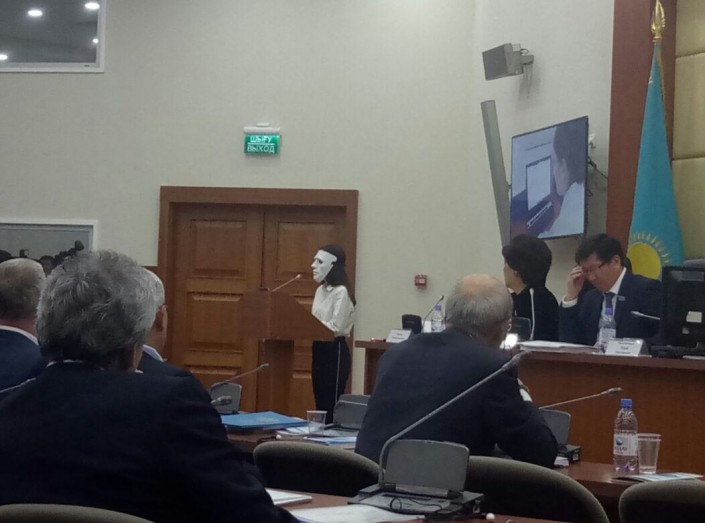 Потерявшая родителей юная казахстанка, которую спасли от суицида сотрудники горячей линии "111", выступила перед депутатами на заседании в Мажилисе в маске, передает корреспондент Tengrinews.kz.
