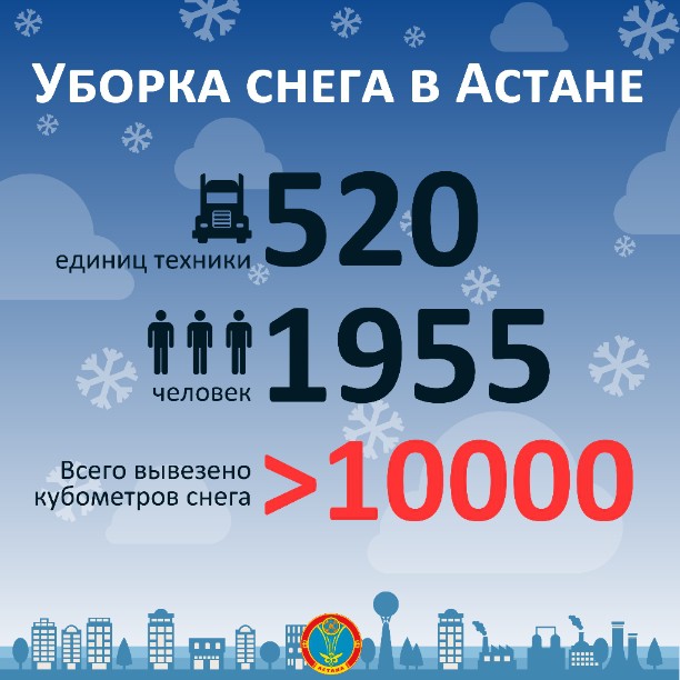 "В Астане выдалось снежное утро. Столичные коммунальщики и специальная техника работают на улицах города в две смены, круглосуточно очищая Астану от снега. На всей территории города трудятся 1955 рабочих и 520 единиц специализированной техники. Количество выделенных работников и специализированной техники варьируется в зависимости от размера автодороги. Так, на таких крупных улицах столицы, как Кенесары, Керей Жанибек хандары, Сейфуллина и проспект Республики задействовано в очистке снега наибольшее количество людей и коммунальных машин", - проинформировали в пресс-службе столичной администрации.