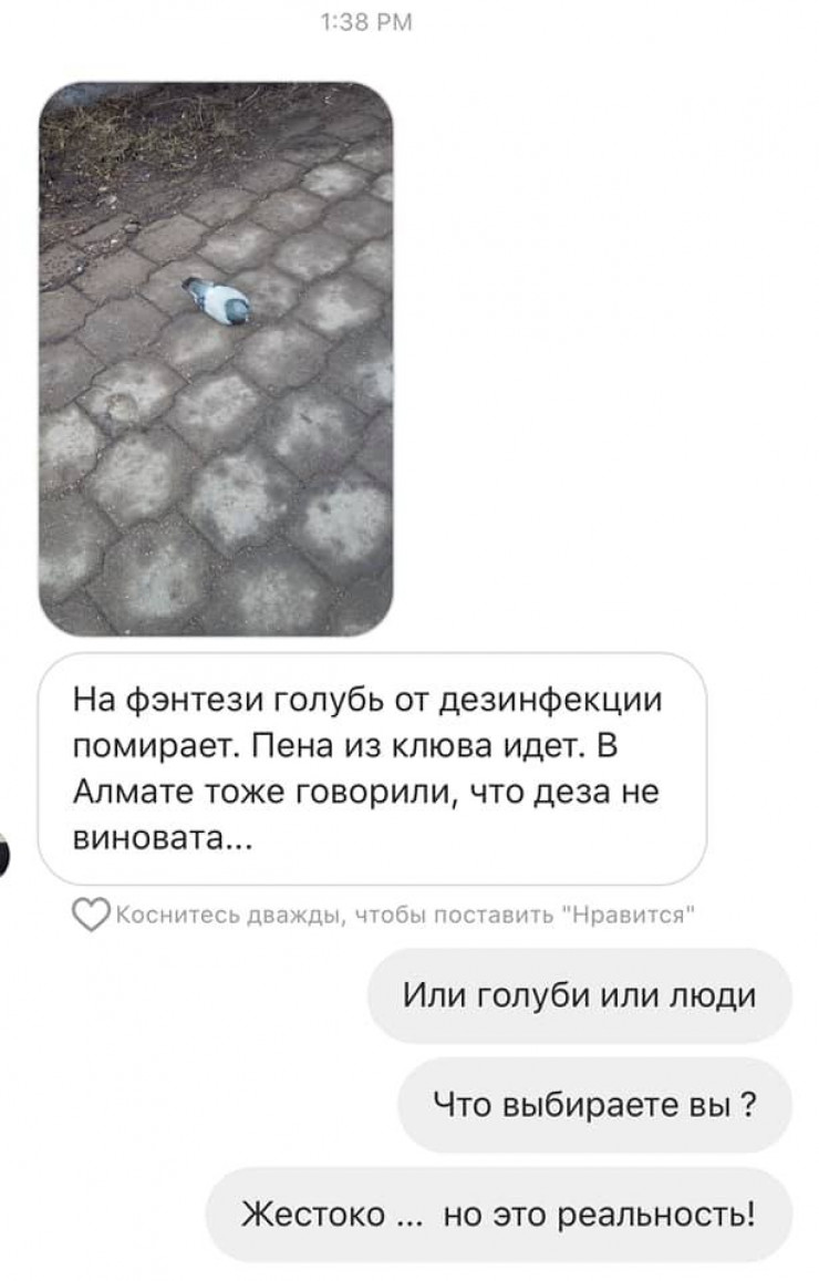 "Одна из фотографий в социальных сетях подписана, якобы умирающий голубь лежит на улице Воинов-Интернационалистов возле одного из развлекательных заведений. Но там дезинфекционная обработка прилегающей территории не проводилась", - отметили в пресс-службе Департамента контроля качества и безопасности товаров и услуг Карагандинской области.