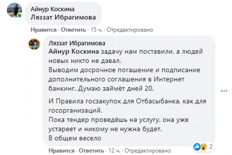 "Задачу нам поставили, а людей новых никто не давал. Выводим досрочное погашение и подписание дополнительного соглашения в интернет-банкинг. Думаю, займет дней 20. И правила госзакупок для "Отбасы банка" - как для госорганизаций. Пока тендер проведешь на услугу, она уже устареет и никому не нужна будет. В общем, весело", - написала Ляззат Ибрагимова.