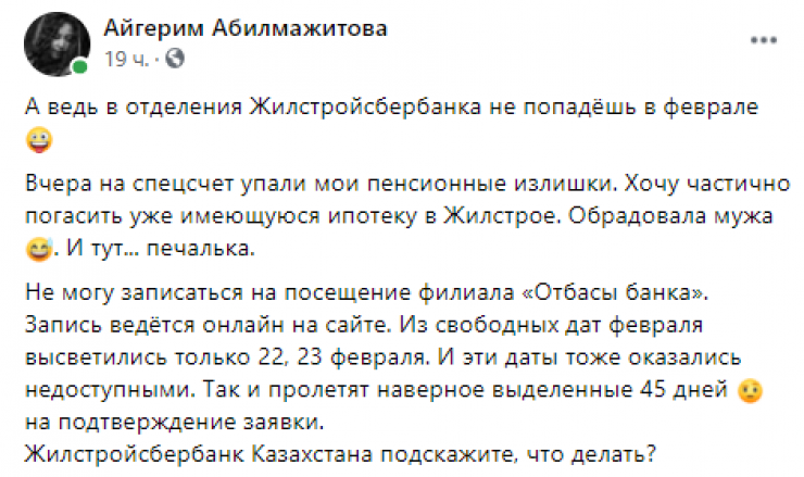 "В отделения "Жилстройсбербанка" ("Отбасы банк") не попадешь в феврале. Вчера на спецсчет упали мои пенсионные излишки. (...) Не могу записаться на посещение филиала "Отбасы банка". Запись ведется онлайн на сайте. Из свободных дат февраля высветились только 22, 23 февраля. И эти даты тоже оказались недоступными. Так и пролетят, наверное, выделенные 45 дней на подтверждение заявки.
