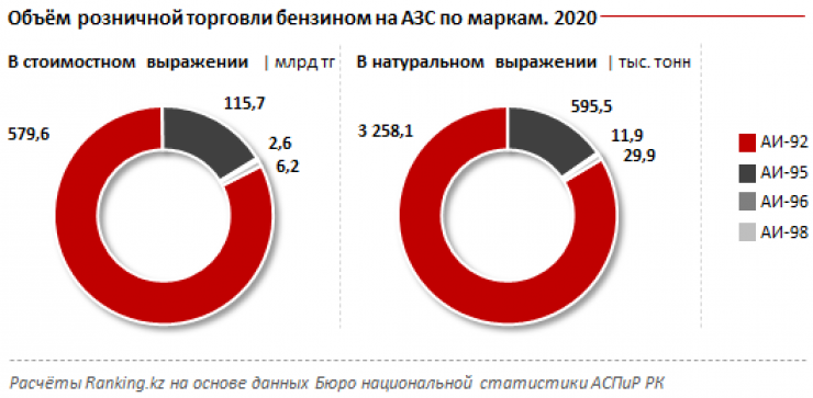 Наибольший объем розничной торговли бензином пришелся на марку АИ-92: 579,6 миллиарда тенге, или 3,3 миллиона тонн.
