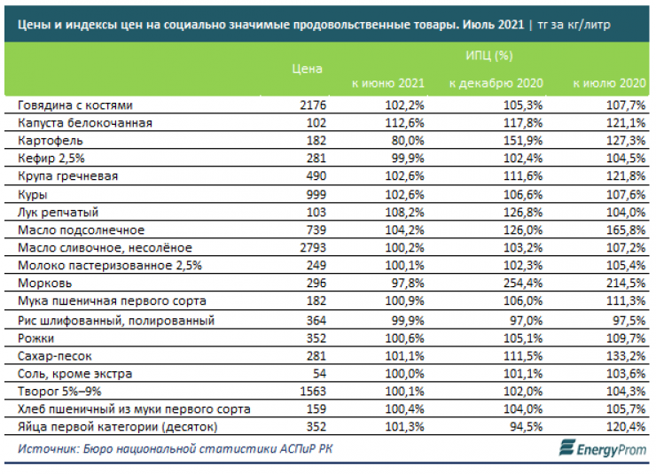 В июле 2021 года по сравнению с прошлым годом значительнее всего среди социально значимых продуктов цены выросли на морковь - в 2,1 раза до 297 тенге за килограмм. Также сильно подорожали: подсолнечное масло - на 65,8 процента до 739 тенге, сахар - на 33,2 процента до 281 тенге за килограмм, картофель на 27,3 процента до 182 тенге за килограмм. Также до 490 тенге выросла цена на килограмм гречки, до 102 тенге - на капусту, до 352 тенге - на яйца.