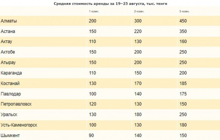 Отмечается, что городом с самой дорогой арендой в стране остается Алматы. В среднем квадратный метр в этом городе сдается по 5 435 тенге. Таким образом, аренда бюджетной однокомнатной квартиры обойдется примерно в 200 тысяч тенге в месяц.