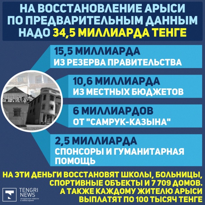 "В итоге запланировано из резерва правительства – 15,5 миллиарда тенге, местных бюджетов - 10,6 миллиарда тенге, из ФНБ "Самрук-Казына" - 6 миллиардов тенге, за счет спонсоров и гуманитарной помощи – 2,5 миллиарда тенге. Однако после завершения подсчетов эта цифра может поменяться. Кроме того, холдингом "Байтерек" будут предоставлены кредиты для малого и среднего бизнеса города Арысь с шестимесячным облегченным периодом до 5 миллионов тенге на 48 месяцев под 1 процент", - заключил министр финансов.