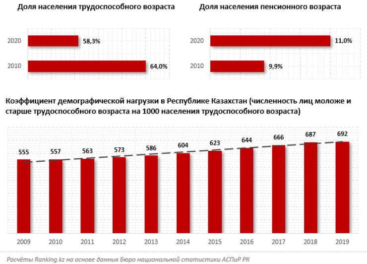 Таким образом, в Казахстане наблюдается старение населения. Если в 2010 году доля населения пенсионного возраста составляла 9,9 процента, то уже в 2020-м - 11 процентов. Тем временем доля граждан трудоспособного возраста, наоборот, заметно снизилась: с 64 процентов в 2010 году до 58,3 процента в 2020-м. Согласно шкале демографического старения Боже-Гарнье - Россета, Казахстан находится на отметке "собственно преддверие старости".