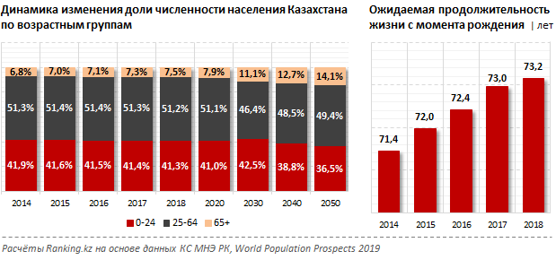 При этом ожидается рост продолжительности жизни в Казахстане. Так, в 2014 году она составляла 71,44 года, а уже в конце 2018 года увеличилась до 73,15 года. Значительный рост ожидаемой продолжительности жизни обусловлен, помимо всего прочего, ростом качества жизни населения.