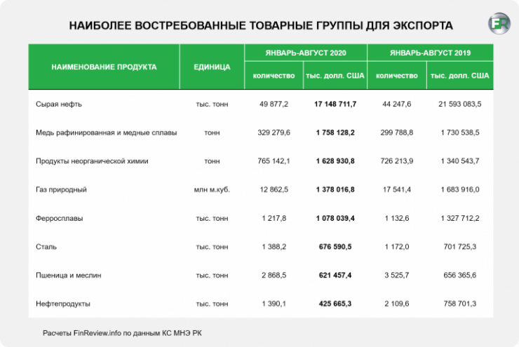 Объем экспорта Казахстана за восемь месяцев 2020 года составил 31,9 миллиарда долларов. В сравнении с аналогичным периодом 2019 года показатель снизился на 5,9 миллиарда долларов, передает Tengrinews.kz со ссылкой на Finreview.info.