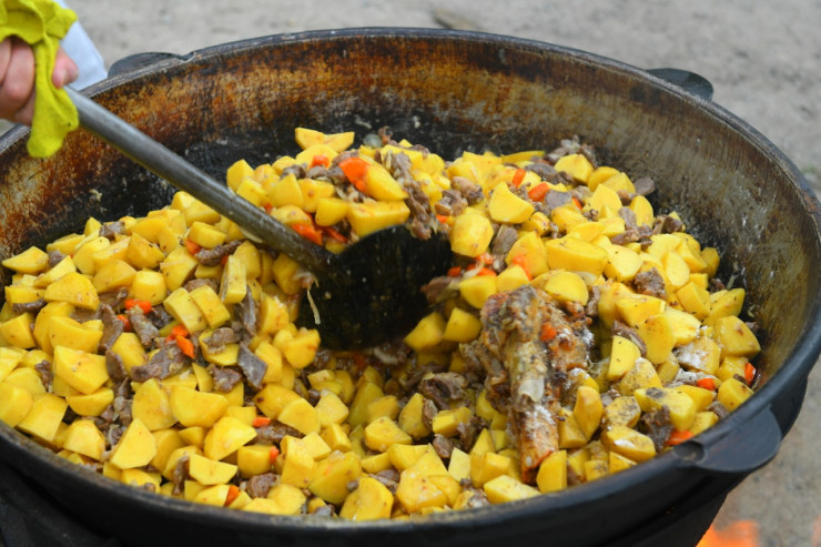 Между тем еще одна группа постояльцев готовит ужин в большом казане на открытом огне. Объемы делают большие, чтобы хватило всем прибывшим. А их в каждом эвакуационном пункте не менее чем по 100 человек.