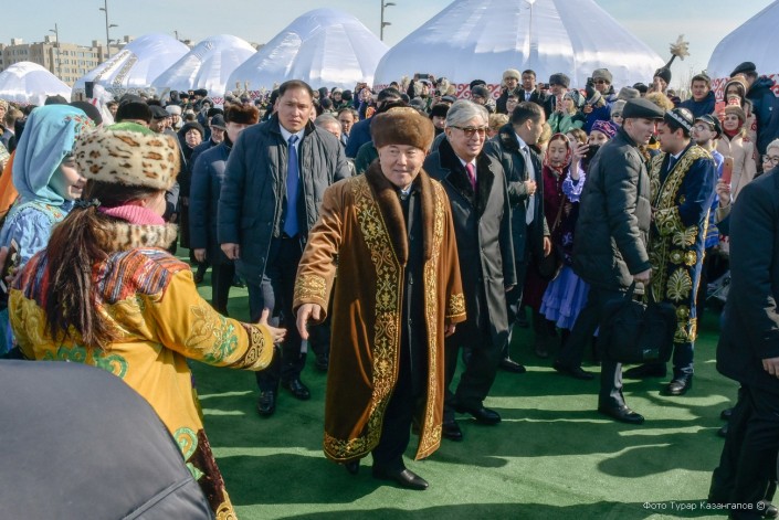 Нурсултан Назарбаев на праздничное мероприятие "Наурыз мейрамы" пришел вместе с Президентом Казахстана Касым-Жомартом Токаевым. Праздник проходит на территории этноаула у монумента 25-летия Независимости Казахстана.