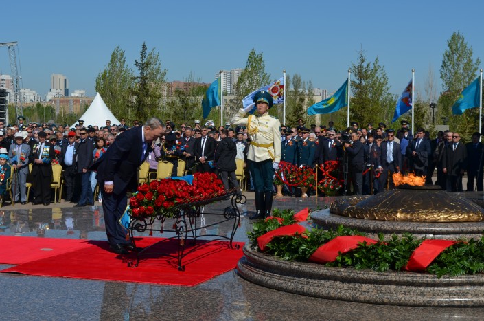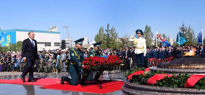 Президент Казахстана Нурсултан Назарбаев принял участие в церемонии возложения "Гирлянд славы" и корзин с цветами к монументу "Отан коргаушылар", передает корреспондент Tengrinews.kz.