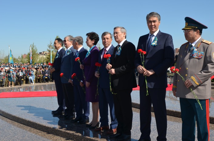На площади у монумента звучали песни военных лет. Собравшиеся почтили минутой молчания память погибших солдат на полях сражений ВОВ. После чего возложили цветы к монументу "Отан қорғаушылар".