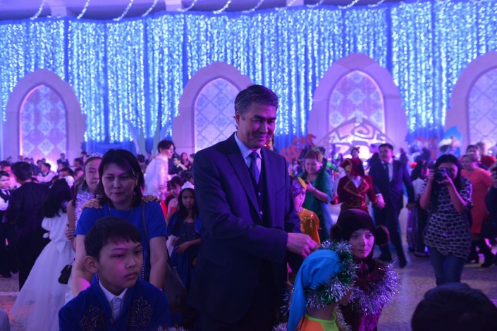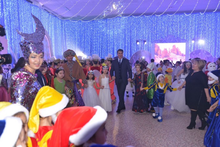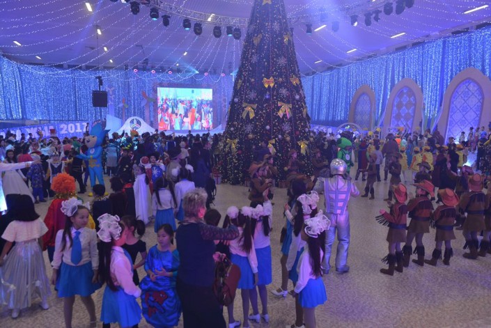 В праздновании приняли участие аким Астаны Асет Исекешев и министр образования и науки Ерлан Сагадиев. Они поприветствовали детей и поводили с ними хороводы. Тема праздника в этом году - "Новогодние огни EXPO".