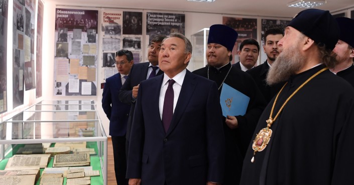 В завершение Президент Казахстана ознакомился с экспозициями музея новомучеников и исповедников духовно-культурного центра Православной Церкви