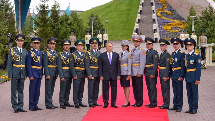 На территории вокруг главного флагштока (этно-мемориальный комплекс "Атамекен") проходит торжественная церемония поднятия Государственного флага, вручения офицерских погон курсантам и запуска праздничных мероприятий, посвященных празднованию Дня столицы с участием Президента Казахстана Назарбаева.
