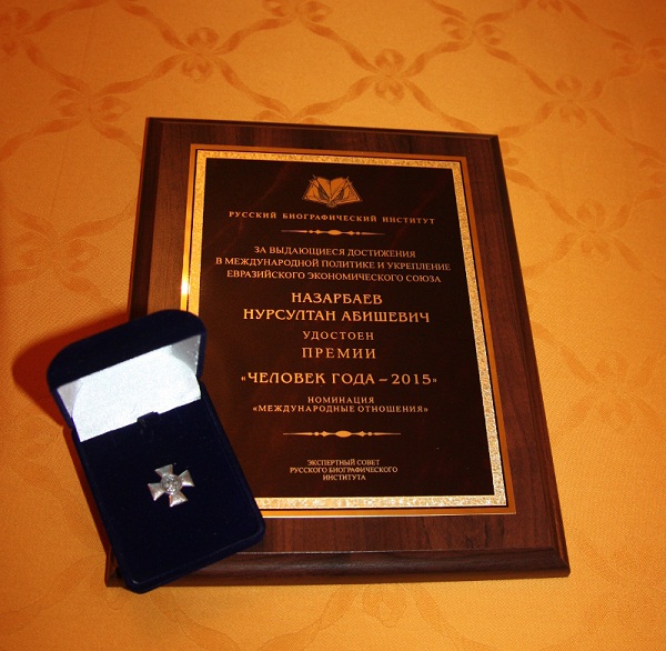 По словам учредителей премии, а это Русский биографический институт и Институт экономических стратегий, Назарбаев отмечен за "выдающиеся достижения в международной политике и укрепление Евразийского экономического союза". В 2012 и 2014 годах казахстанский лидер также становился лауреатом данной премии.