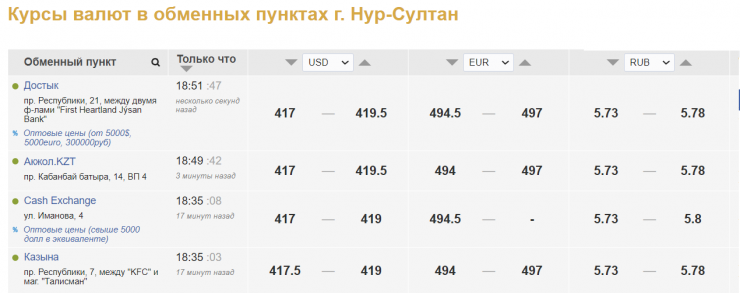 В обменных пунктах Нур-Султана доллар продают за 419-419,5 тенге, покупают за 417-417,5 тенге. В обменных пунктах Алматы продажа сложилась на уровне 419,5-420 тенге, покупка - 418-418,5 тенге.